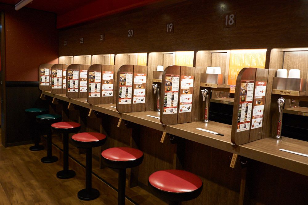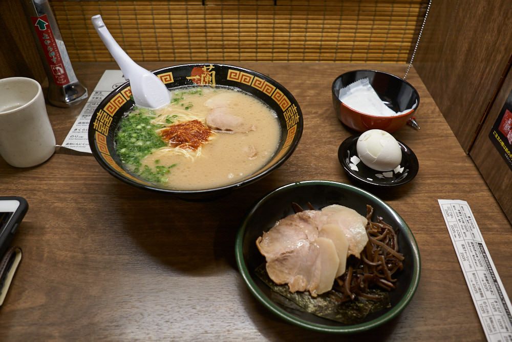 Ichiran! It might be Japan's most popular restaurant. If you're unaware, Ichiran is the popular "vending machine restaurant" you may have heard about. While there is some human interaction with the greeters Ichiran is for the most part a solemn experience. You order your meal at the vending machine, get your ticket, sit in your booth, they take your ticket (you have the chance to make changes at the booth before they take your order), and finally, your food arrives.