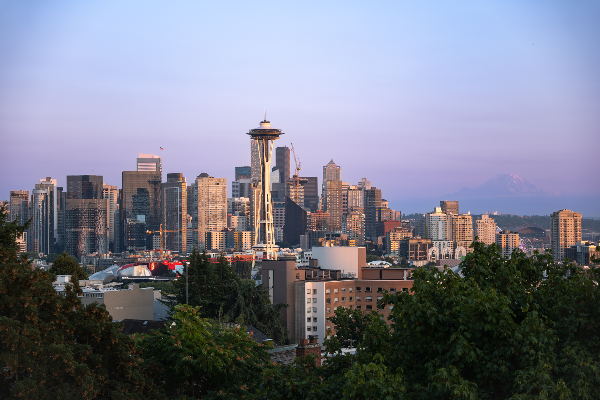 Kerry Park is the place for a good view of Seattle's downtown skyline. A little Northwest of downtown, it provides not only a great view of the city but Mount Rainier as well if you're lucky.